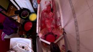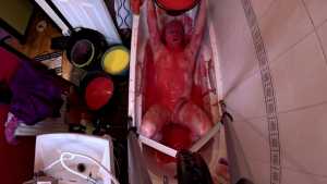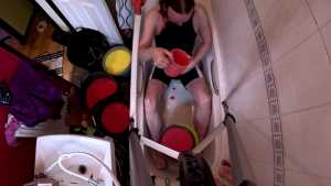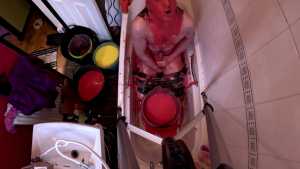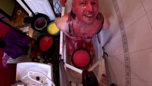 After cumming, he pours one last bucket of gunge over himself.