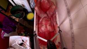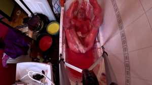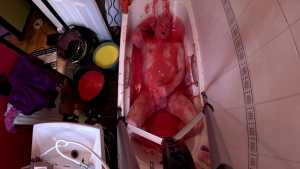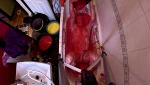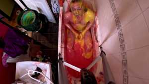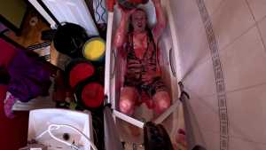 Wakka is in the bath wearing a one-piece swimsuit, and five buckets of gunge.